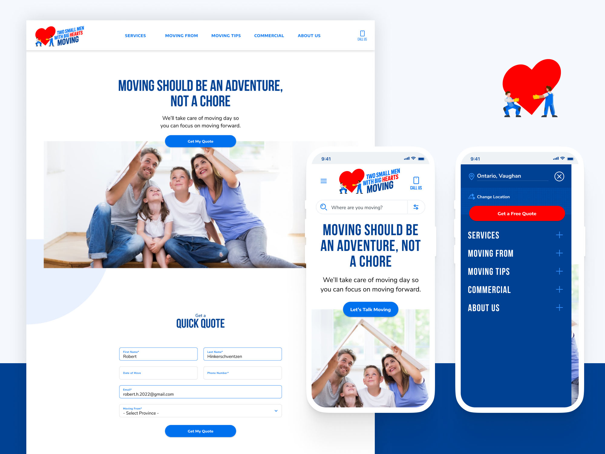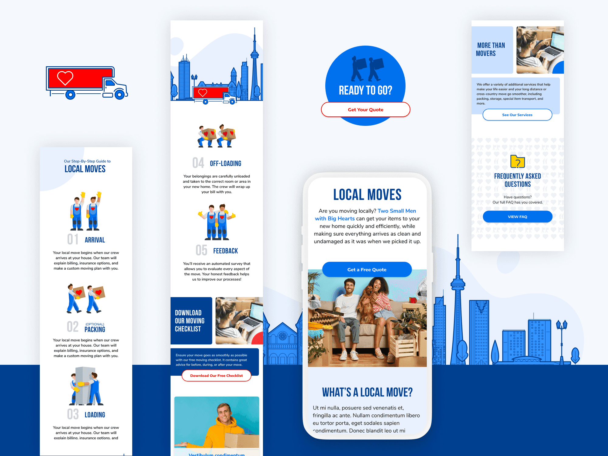 We designed this site mobile first due to the user base and how the site is used more like an app rather than a desktop site. Using slide out navigation to quickly jump to specific sections helps with scroll-fatigue. To help mobile users even more, we created a quick app-style walkthrough to quickly filter the move details based by type of house, bedrooms, etc. to quickly get a quote and give the Two Small Men Moving Sales team a leg up.