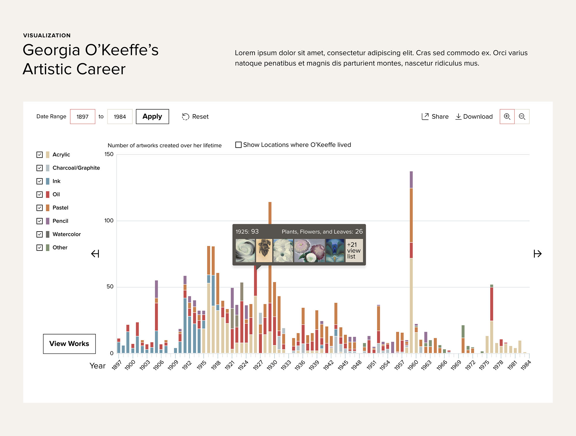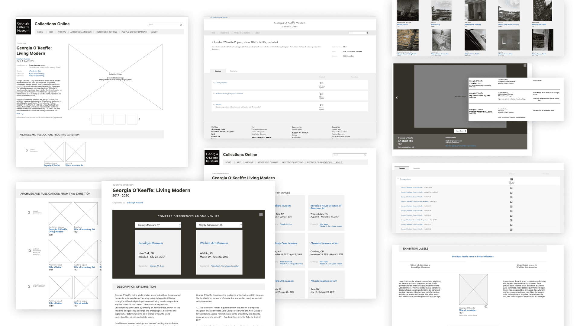After the site had been live for a year, I was tasked to design the visualization of the artistic career of Georgia O'Keeffe. It was an incredible experience to look at all the items available to showcase and simplify it into an easy-to-use solution. Hover effects bring up screen shots and other information. Click here to try it out.