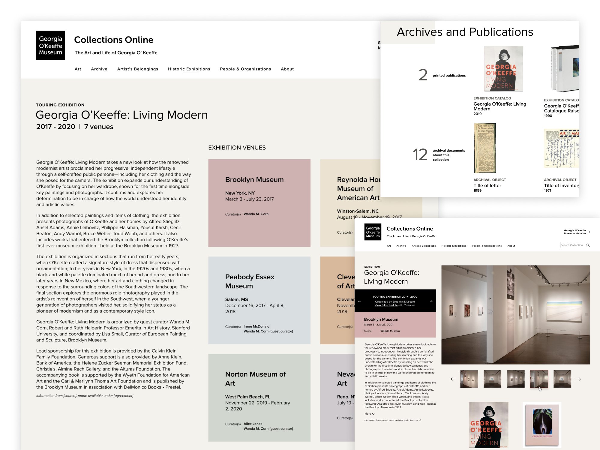 We used a subtle color pattern to showcase the various Museums where the traveling exhibitions were showcased. It was amazing to see the exhibition photos from the archives that dated back over 75 years ago.