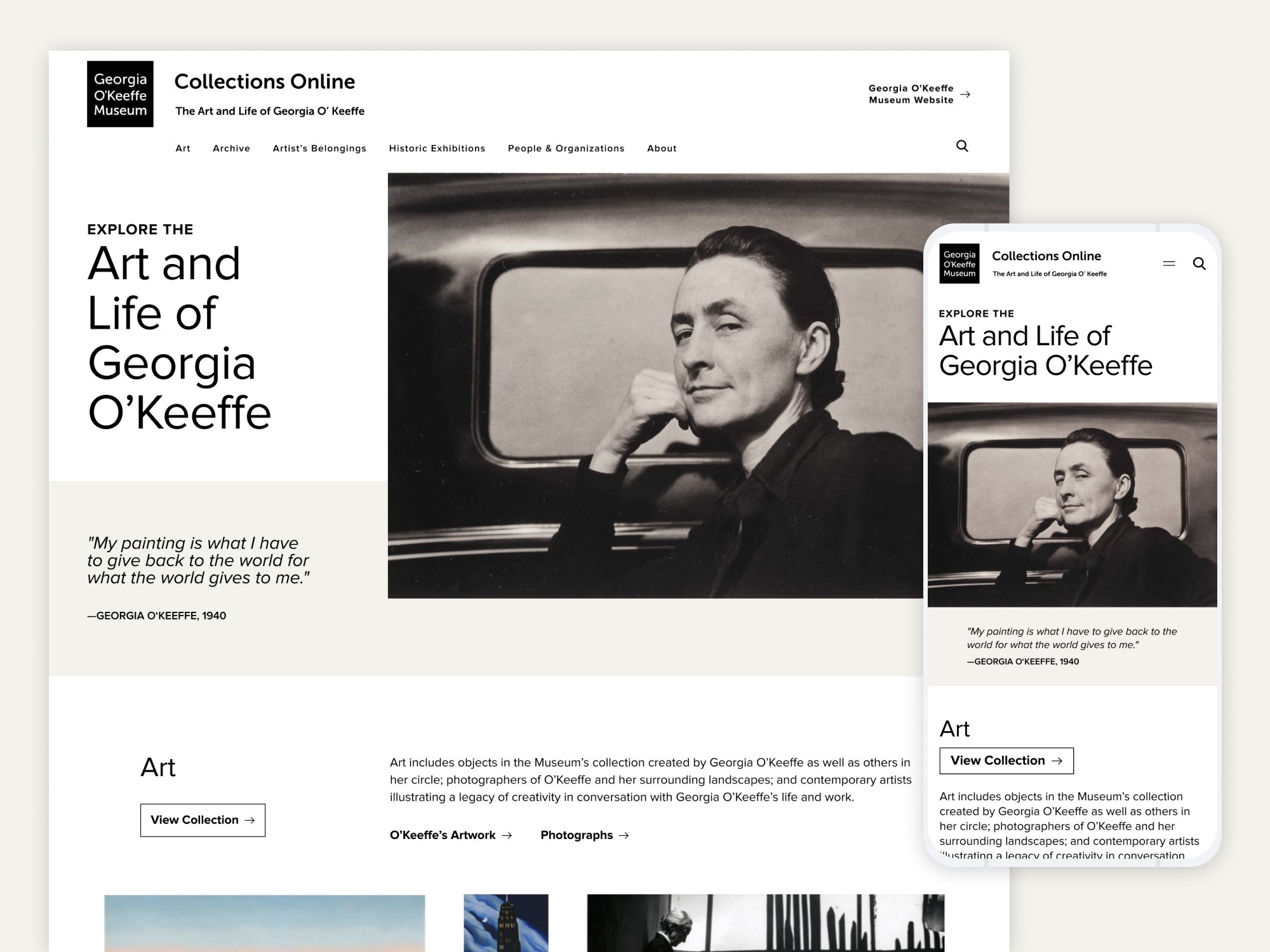 A fresh new web look and experience for the Georgia O'Keeffe's museum collections in Santa Fe, New Mexico. Showcasing the esteemed artist and making sure her work shines on every page.