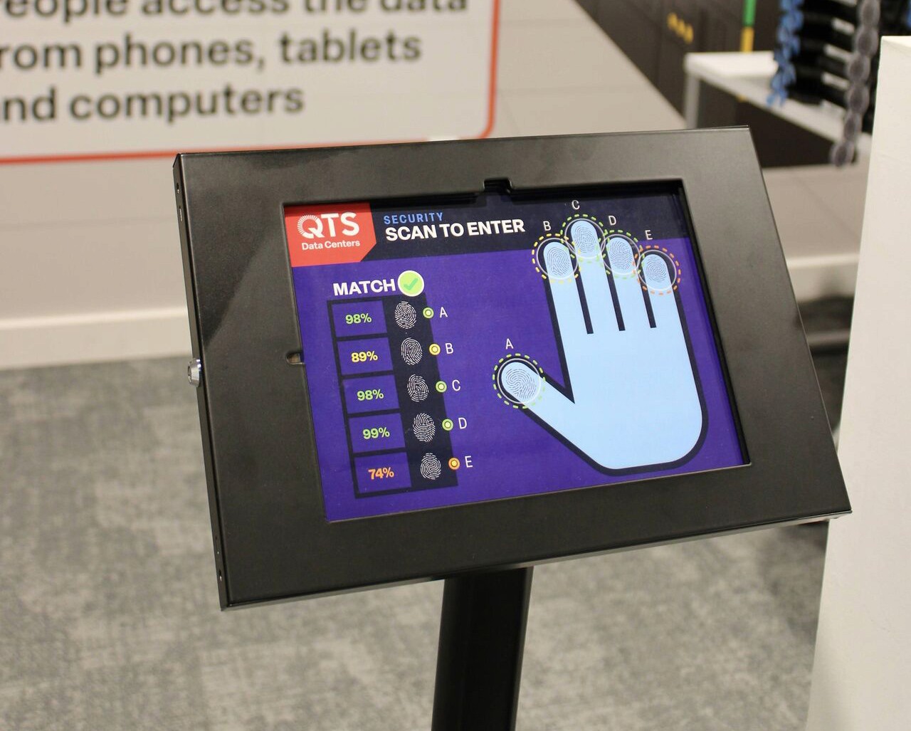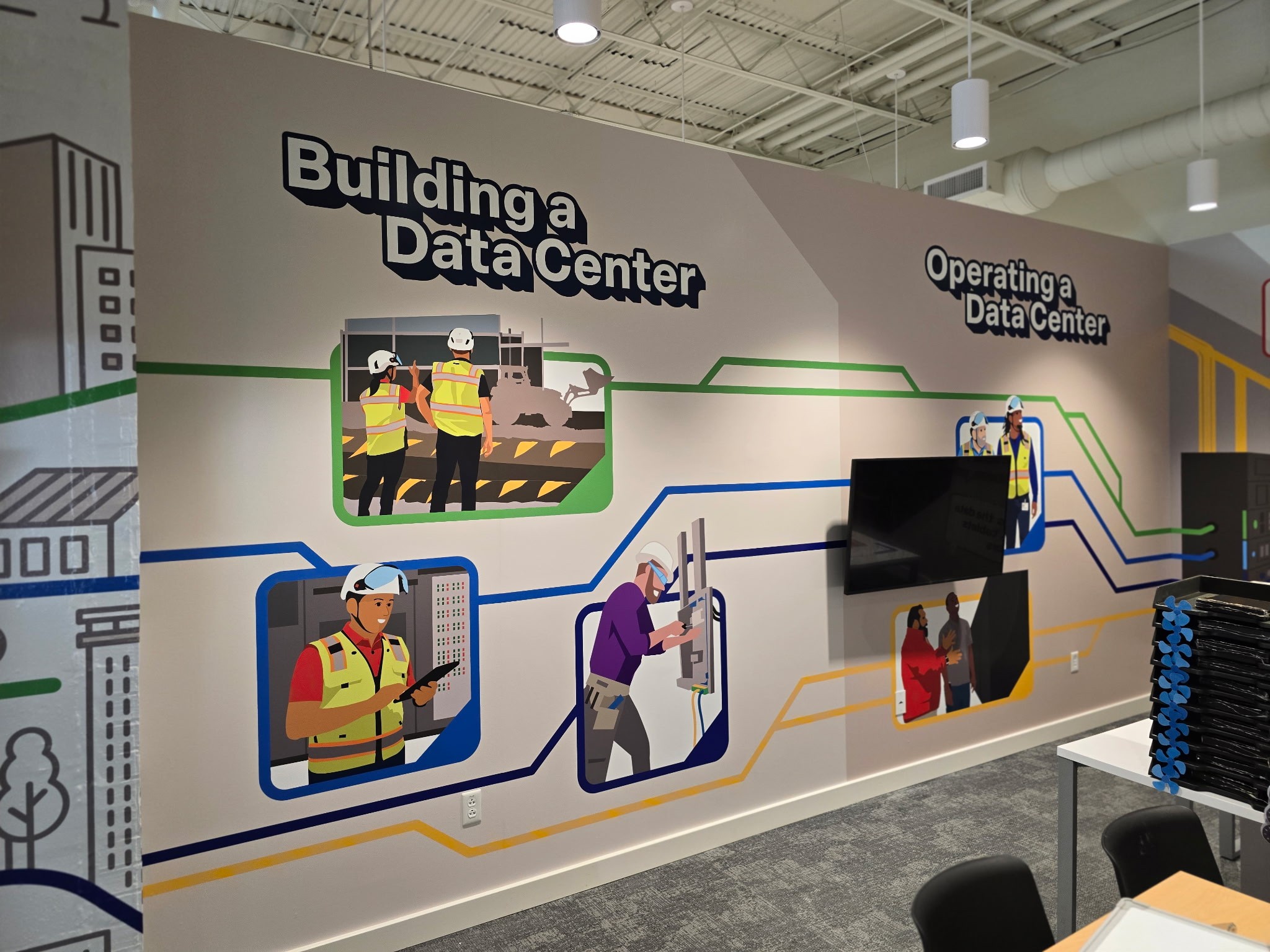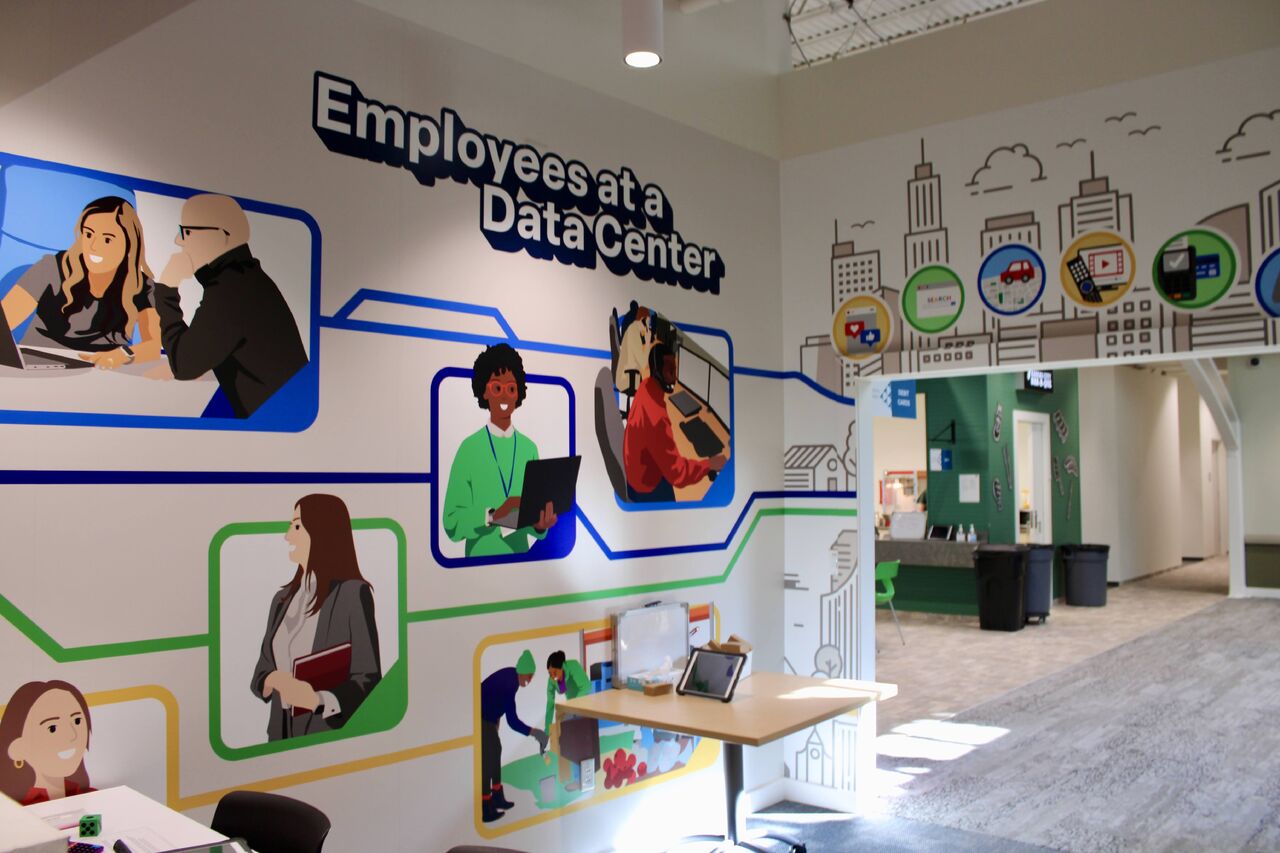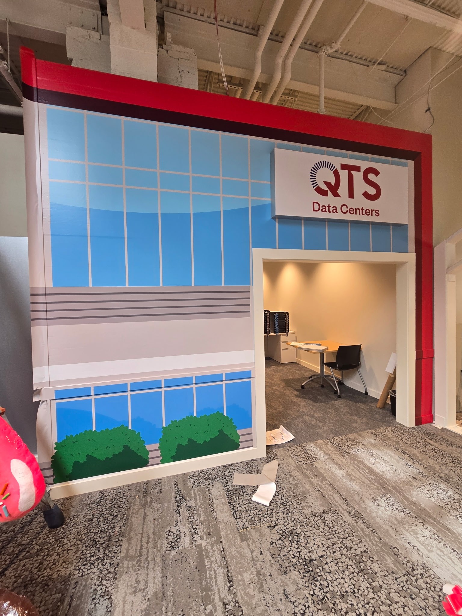 Created a complete interactive data center experience for Junior Achievement's BizTown, teaching kids about data centers and technology careers. Designed and illustrated an entire server room environment including full wall wraps, a working hand scanner prop, security camera feed displays, and educational breakouts explaining different QTS career paths. The project included custom icons, layouts, and vector illustrations that helped kids understand what data centers do and how they impact daily life.