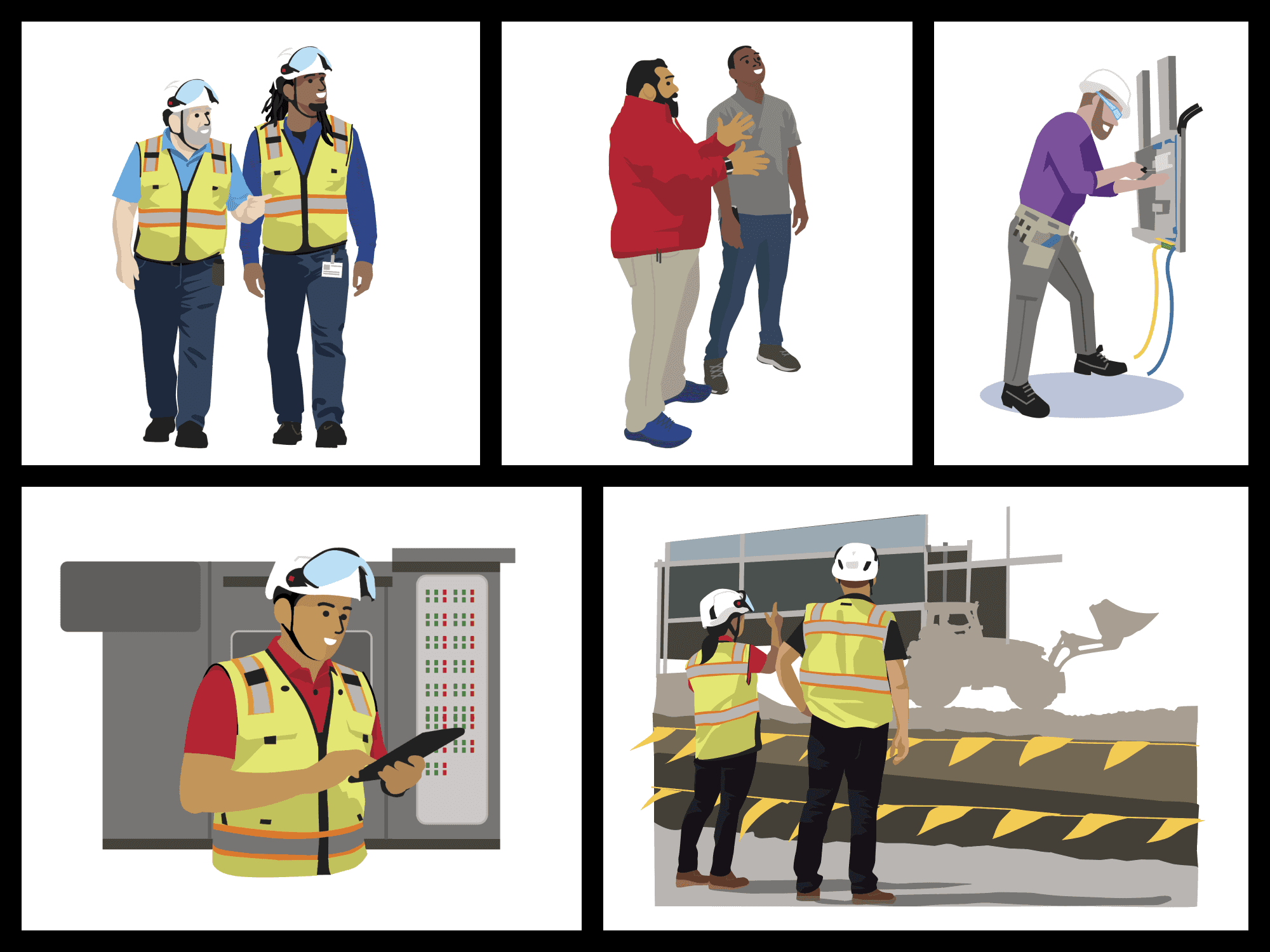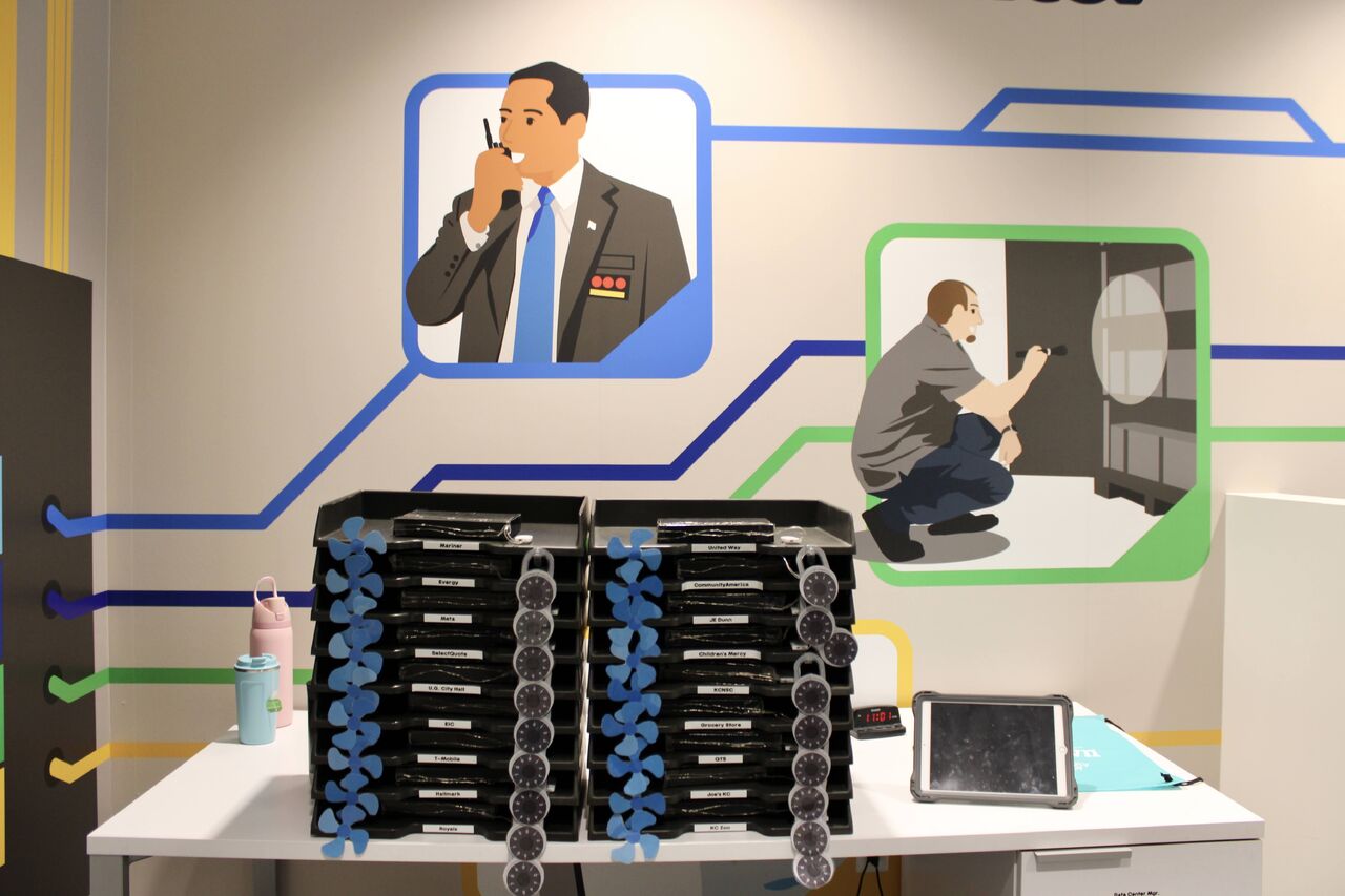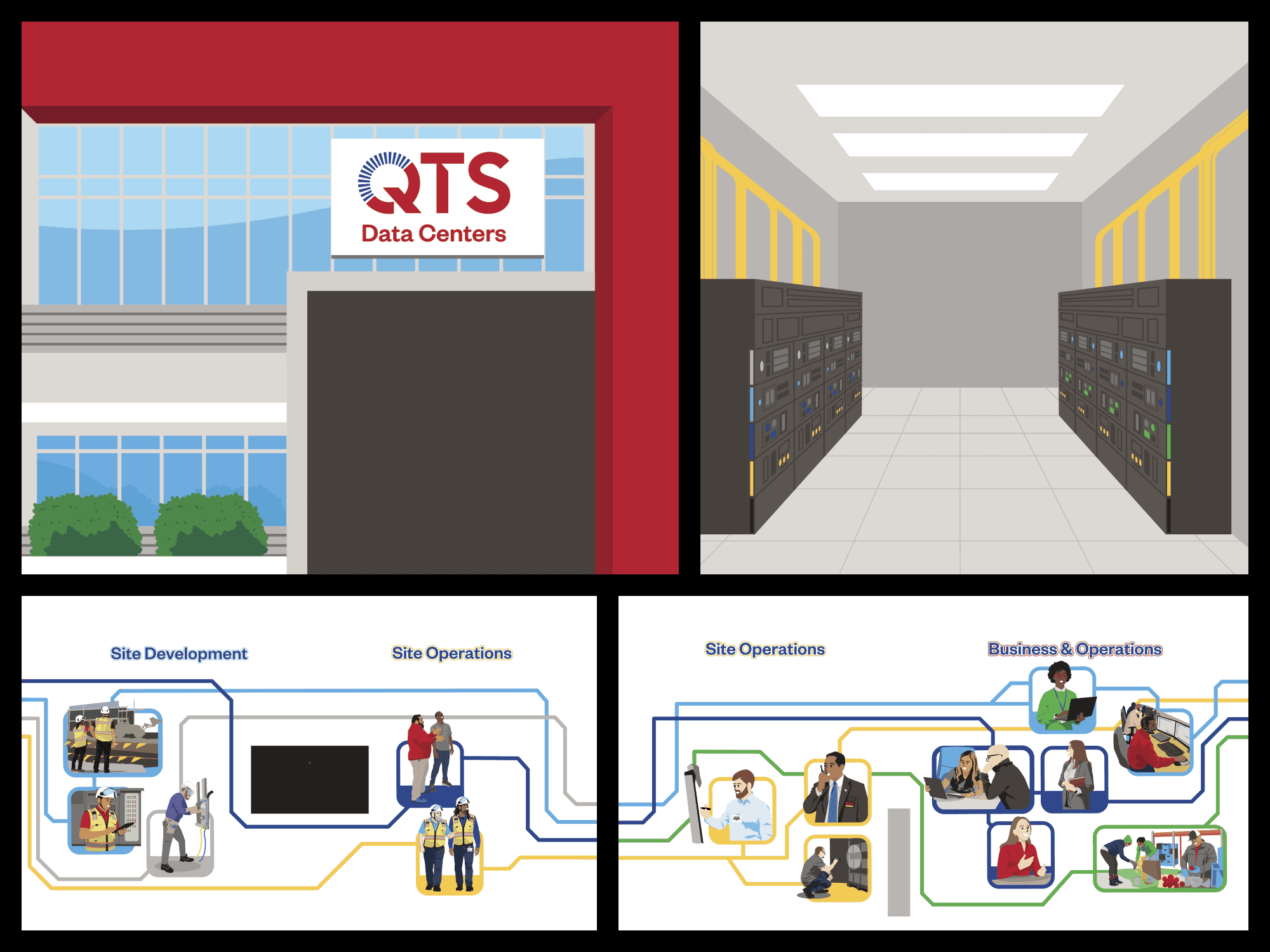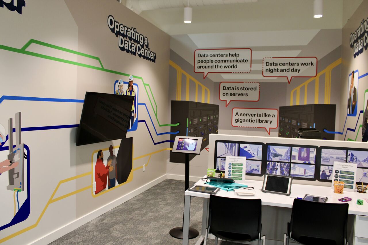 Created a complete interactive data center experience for Junior Achievement's BizTown, teaching kids about data centers and technology careers. Designed and illustrated an entire server room environment including full wall wraps, a working hand scanner prop, security camera feed displays, and educational breakouts explaining different QTS career paths. The project included custom icons, layouts, and vector illustrations that helped kids understand what data centers do and how they impact daily life.